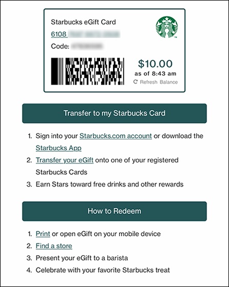 A Starbucks eGift Card is the perfect treat for their. Heres how to share that perfect sip feeling with your frien. Enter the recipient name and email address to send the Starbucks Card eGift within minutes after the order has been completed.